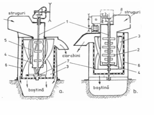 bucsei, care se roteste cu o turatie de 760 rot/min si apoi centrifugati spre peretii cilindrului perforat al scurgatorului. Orificiile practicate in acest cilindru permit trecerea mustului aderent la ciorchini, retinind in interiorul cilindrului ciorchinii scursi. Dispunerea in spirala a paletelor bucsei scurgatorului face ca ciorchinii ramasi sa fie impinsi spre conducta de evacuare a scurgatorului prin care sint proiectati, centrifugal, in afara salii de prelucrare.