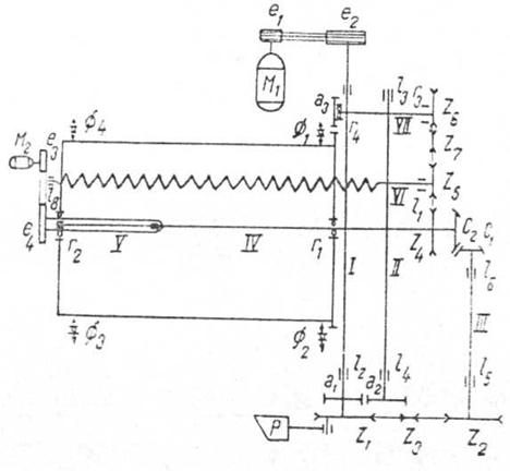 Schema cinematica a agregatului este prezentata in figura 2.17. Cuplul motor, dezvoltat de catre electromotorul M1 se transmite axului valt 1 al zdrobitorului, prin rotile de curea Q si C2, si patru curele trapezoidale. De aici este distribuit axului-valt 2 prin rotile de lant a1 si a2 si axului intermediar 3, prin rotile de lant z1 si z2. Tot de la roata de lant z1 prin excentricul acesteia, se face antrenarea pistonului P al pompei de mustuiala. De la axul intermediar 3 cuplul este transmis axului deseiorchinator 4 prin grupul conic c1 si c2, si de la acesta, prin rotile de lant z4, z5 si z6 la axul 4 al melcului transportor de mustuiala si la axul intermediar 7. De la axul intermediar 7 miscarea este transmisa cilindrului separator prin roata dintata cilindrica a3 si coroana a4