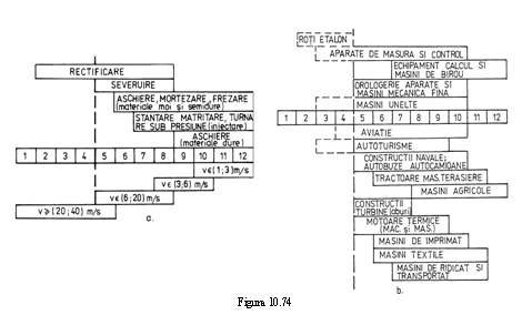 In tabelele 10.38, 10.39 si 10.40 se prezinta rugozitatile maxime si procedeele de prelucrare prin care pot fi obtinute functie de viteza periferica si asigurarea preciziei de angrenare.