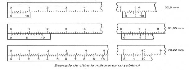 Evaluarea dimensiunii masurat se face citind numarul de milimetri de pe rigla gradata depasit de reperul "0" de pe vernier, la care se adaug o fractiune calculata in felul urmato: se observa a cat diviziune de pe vernier se alinieaza cu una de pe rigla si se inmulteste cu precizia de masurare a sublerului ,conform formulei: