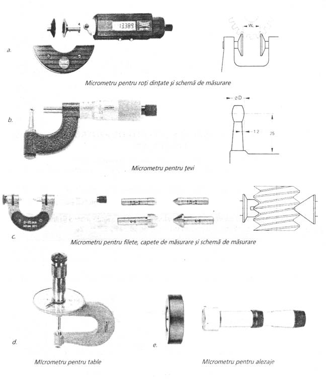 Micrometrele de uz special au forme sau accesorii speciale, in functie de forma piesei sau a cotei care se masoara (fig 14a,b,c,d,e)