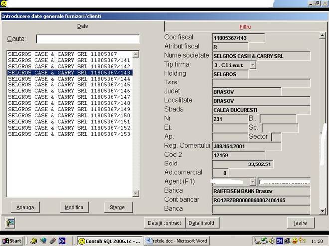 In sectiunea DETALII CONTRACT se completeaza produsele cu preturile conform contractului negociat, iar in dreapta in NUME2 se trece CODUL DE PRODUS alocat de retea. Detaliile contract se completeaza numai pentru firma mama (cea fara / in codul fiscal) si vor fi alocat d eprogram automat in momentul facturarii tuturor magazinelor din aceelasi holding.
