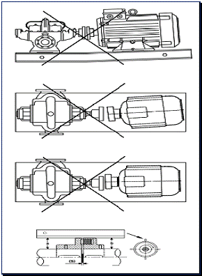 Se regleaza calele din metal sau penele pana cand axul pompei si al actionarii sunt la acelasi nivel. Se verifica fetele cuplajelor si flansele de aspiratie si refulare ale pompei pentru pozitia orizontala sau verticala cu ajutorul nivelei cu bula de aer. Se corecteaza pozitiile, daca este necesar, regland calele sau penele sub placa de baza dupa necesitati. Fetele semicuplajelor vor fi distantate suficient astfel incat sa nu se poata atinge intre ele. Se va lasa toleranta necesara pentru uzura lagarelor axiale. De obicei, producatorul cuplajului specifica o distanta minima de separare intre semicuplaje si se vor consulta instructiunile acestuia pentru a verifica daca distanta este corecta.