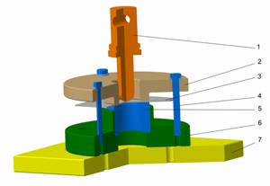 Standul este compus din poansonul 1, proiectat īn asa fel īncāt sa se poata monta pe traversa mobila a masinii, placa port-pastila 6, care se fixeaza pe masa masinii 7, pastila activa 5 si placa de retinere 2.