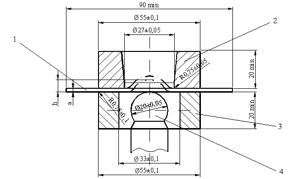 Figura nr. 10.1 - 1 epruveta, 2 matrita, 3 inelul de strangere, 4 poanson, a grosimea epruvetei, h adancimea de ambutisare