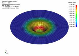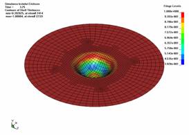 Distributia grosimii tablei īn momentul premergator ruperii, este prezentata īn figura 8. Se observa o reducere procentuala a acestei grosimi de 40,%, īn focarul deformatiei, dar si pastrarea īn limitele grosimii initiale, pentru mai mult de 85% din suprafata piesei.