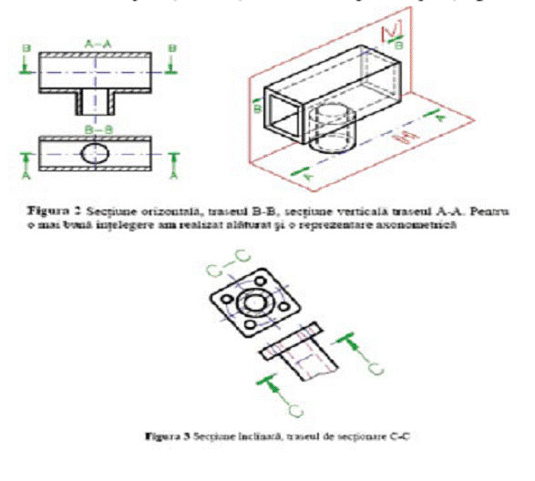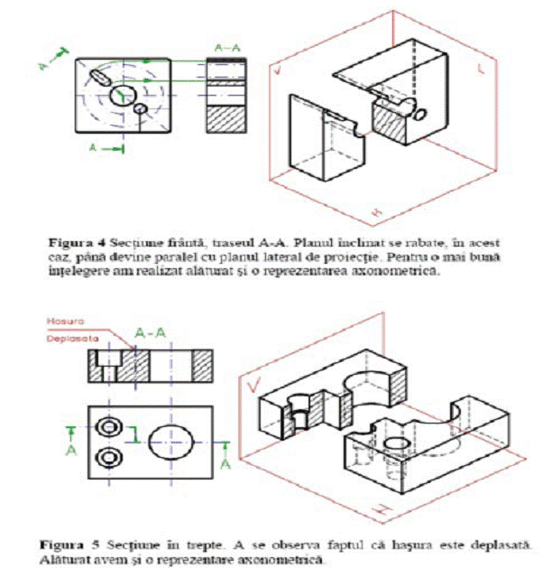 b) Sectiune franta, cand suprafata de sectionare este formata din doua sau mai multe plane care fac intre ele unghiuri diferite de 90s, (figura 4). De retinut ca in acest caz planul care este inclinat se rabate pana cand devine paralel cu unul din planele de proiectie.