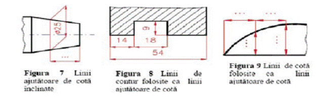 Pentru a nu afecta claritatea cotarii, in unele cazuri (figura 7), liniile ajutatoare de cota se pot trasa inclinat la 60s, fata de liniile de contur.