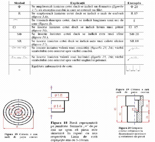 In unele cazuri pentru a putea intelege corect forma geometrica a pieselor, cotele inscrise pe desen sunt precedate, dupa caz, de simboluri grafice. In tabel sunt prezentate simbolurile care sunt folosite la cotare.