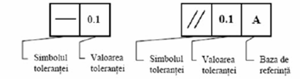 Pentru notarea tolerantelor geometrice pe desen, se utilizeaza un cadru dreptunghiular, trasat cu linie continua subtire. Cadrul contine doua, trei casute, sau mai multe casute, avand urmatoarea destinatie (Figura):