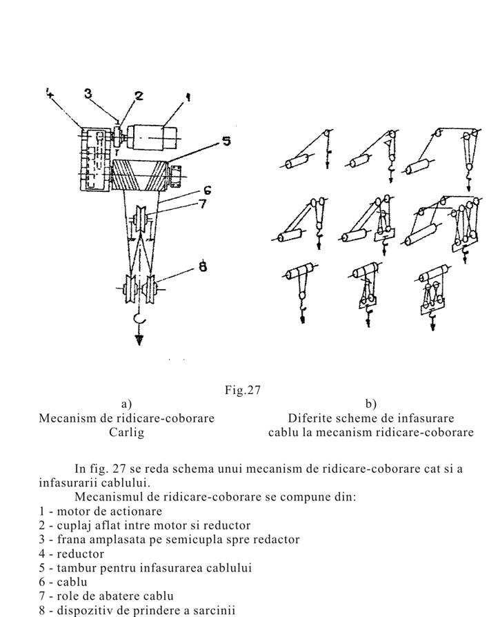 b) - Mecanismul de ridicare - coborare , alcatuit din sistemul de infasurare a cablului si mecanismul de antrenare ; sistemul de infasurare a cablului este la randul sau alcatuit din mufla, tambur de cablu, bloc de role si rola de egalizare, iar mecanismul de antrenare, din motor , cuplaje, frana, reductor si cuplaj pentru tambur