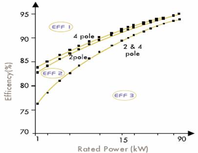 Cele mai obisnuite motoare de pe piata la ora actuala sunt cele din clasa de eficienta eff3 , motoarele cu eficienta eff2 prezinta randamente imbunatatite in timp ce motoarele eff1 prezinta eficienta ridicata si un randament conform prescriptiilor americane si canadiene.