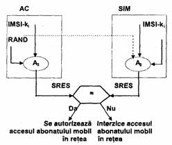 Fiecare utilizator dispune de o cheie individuala, care este memorata în doua locuri în sistem: în modulul de identitate al utilizatorului (SIM) si în centrul de autentificare (AC). Centrul de autentificare (AC) genereaza numarul aleator RAND. Pe baza lui RAND si a IMSI-ki, folosind algoritmul A3, se obtine numarul SRES (Signed Response), care este trimis bazei de date temporare (VLR). De asemenea, AC trimite valoarea RAND si statiei mobile. Aici, tinând cont ca valoarea IMSI-ki este stocata si în modulul de identitate a utilizatorului, pe baza aceluiasi algoritm de criptare A3, se poate calcula valoarea SRES, care este de asemenea transmisa bazei de date temporare. Aceasta va compara cele doua valori obtinute si, daca ele sunt identice, va permite accesul utilizatorului în sistem.