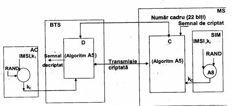 Criptarea transmisiei pe mediul radio are ca scop evitarea interceptarii ilegale a apelurilor. Ideea ce trebuie retinuta este aceea ca acest mecanism de criptare actioneaza numai pe interfata radio; daca un apel de la/spre un utilizator GSM traverseaza si reteaua fixa, atunci, pe aceste portiuni, regulile de criptare sunt diferite de cele utilizate în GSM pe interfata radio (sunt specifice retelei traversate). Algoritmul (simplificat) de criptare a transmisiei pe mediul radio este prezentat în figura 4.