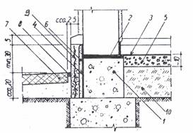 . 1- perete exterior(soclu); 2-hidroizolație orizontala; 3-hidroizolație de separare a pardoselii,dintr-un strat de carton bitumat sau impaslitura; 4- hidroizolație bituminoasa verticala(vopsire cu mastic bituminos); 5- strst de rupere a capilaritații din pietris; 6-tencuiala de protecție a izolației soclului cu mortar de ciment; 7- trotuar; 8-rost umplut cu mastic bituminos;9-
