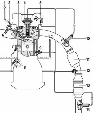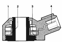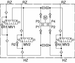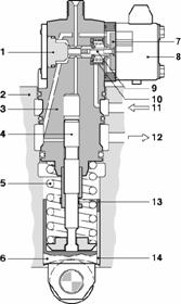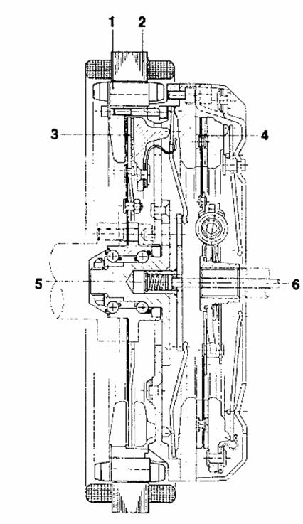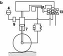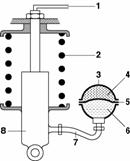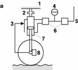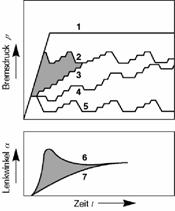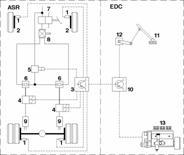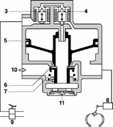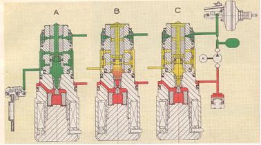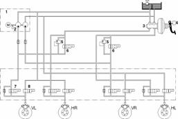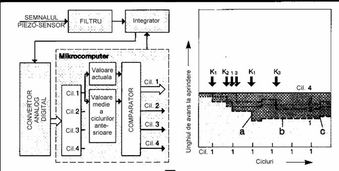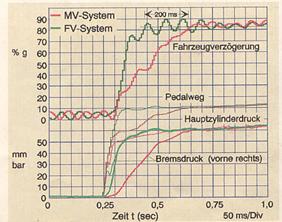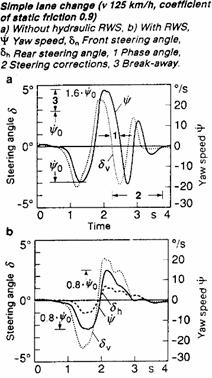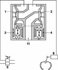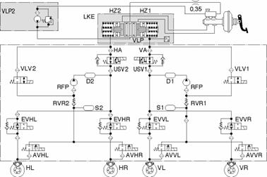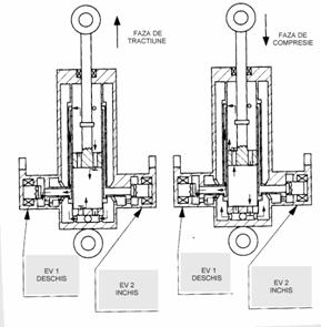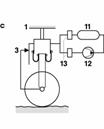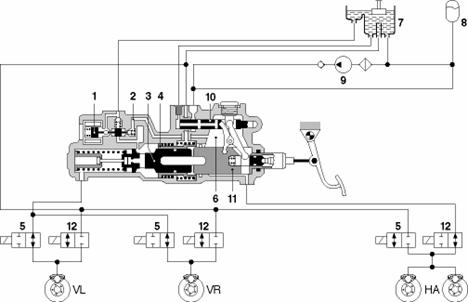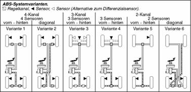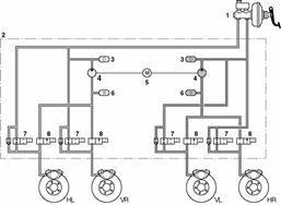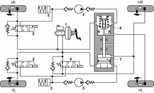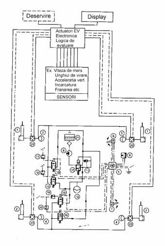 rezulta deceleratii cuprinse intre Tabela 2 releva urmatoarele: - Domeniul de variatie a spatiului de franare a diverselor constructii de autoturisme variaza in limite destul de largi res- pectiv intre 37 m(AUDI,BMW,Mercedes Benz) la 58 m (SEAT,Rover). - La acelas model spatiile de franare au o variatie de 2m (Alfa Romeo) pana la 14 m (Rover,Seat). In primul caz,ar trebui luate in consideratie si calitatile pneurilor si influenta carosabilului ,intrucat rezulta deceleratii medii peste 10 m/s2,dar si inaltimea centrului de masa si variatia sarcinii pe punti. A doua constatare se refera la fenomenul de “Fading",respectiv influenta temperaturii asupra coeficientului de frecare din frane (Rover;Seat).Diferente peste 4 m indica influenta fadingului. Influenta marcii pneurilor,starea pneurilor si a carosabilului pot reduce deceleratia medie care se obtine cu spatiile de franare din tabela 2 cu 15 % . Fig.4 Schemele circuitelor hidraulice cu ABS In figura de mai sus se prezinta variantele posibile a sistemelor de antiblocare caracterizate prin eficienta tehnica si efort constructiv. Din aceasta clasificare rezulta ca importante sunt numarul de canale si numarul sensorilor.Dupa eficienta variantele 1 si 2 sunt cele mai performante dar si cele mai costisitoare.Schema agregatului hidraulic rezulta din figura.Variatia presiunii din cilindrii receptori RZ depinde de pozitia electrovalvelor MV.Aceste electrovalve se clasifica in functie de pozitia hidraulica (in cazul de fata 3 )si de numarul racordurilor (3).Prin urmare electrovalva este de tipul 3/3. Fig.5 Schema hidraulica a sistemului ABS cu electrovalve 3/3. Fig.6 Varianta economica a sistemului ABS Diagrama de functionare rezulta din oscilograma.La acest sistem actuatorul (MV) este amplasat in circuitul de lucru fapt ce introduce o stranglare in circuitul hidraulic si mareste perioada de crestere a presiunii diin sistem.Utilizand o valva de lucru flotanta Sistemul Flow valve al firmei Lucas) in circuitul de lucru actuatorul electromagnetic poate fi amplasat in derivatie.In cazul acesta se renunta la faza de mentinere constanta a preesiunii,dar se obtine scurtare cresterii de presiune. Fig.7 Principiul de functionare a sistemului ABS cu valva flotanta Fig.8 Comparatie intre parametrii de functionare a sistemelor ABS In cazul unui coeficient de aderenta asimetric se creiaza un moment de giratie in sensul aderentei mai mari.Acest moment de giratie in functie de cresterea sa in timp poate deveni o perturbatie pentru tinuta de drum. Fig.9 Crearea momentului de giratie pe carosabilul cu aderenta asimetrica Curba 1 reprezinta variatia presiunii din cilindrul principal; 2-variatia presiunii de franare in cilindrul receptor al rotii cu aderenta mare (high) fara compensarea momentului de giratie;Curba 5 variatia presiunii la roata cu aderenta scazuta.Curba 3 reprezinta crestera de presiune la roata cu aderenta buna in cazul compensarii I a momentului de giratie,aplicata la auttovehiculele cu o maniabilitate mijlocie.Curba 4 reprezinta cresterea de presiune la roata cu aderenta buna in cazul unui autovehicul cu o maniabilitate slaba (compensarea momentului de giratie II).Curba 6 si 7 indica variatia unghiului de rotire a volanului fara si cu compensarea momentului de giratie. Fig.10 Modul de compensare a momentului de giratie perturbator Deoarece compensarea momentului de giratie se realizeaza prin subfranarea unei roti de directie spatiul de franare creste la aplicarea compensarii momentului de giratie.Pentru a limita acest efect,sistemul trebuie foarte bine adaptat la particularitatile constructive ale autovehiculului.In functie de satisfacerea acestei cerinte Stabilitatea miscarii/spatiu de franare minim se adopta una din filosofiile de reglare: IR-Reglare individuala a rotilor; IRM-Reglare individuala modificata; SL-(Slow low) roata care blocheaza mai repede se ia in considerare la reglare ; HL-(High low) roata cu aderenta buna se ia in considerare la reglare. Fig.11 Sistemul ABS 5..8 (Bosch) Sistemul de antiblocare ABS 5...8 (Bosch)are ca actuatori o pereche de electrovalve 2/2 pe roata reglata.S-a realizat o familie modulara de sisteme ABS cu posibilitati largi de diversificare si dezvoltare. Fig.12 Tiposeria de electrovalve pentru sisteme ABS/ASR a.Electrovalva de admisie; b.electrovalva de evacuare; c.electrovalva de aspiratie; d.electrovalva de comutare; 1 manseta supapei unisens. Pentru o slabire rapida a franei de roti in paralel cu supapa de admisie se monteaza o supapa unisens format de regula dintr-o manseta deformabila. In fig.13 se prezinta un sistem de franare cu amplificator de forta hidraulic.La o franare normala lichidul de frana,datorita deplasarii spre dreapta a sertarului de frana 10, ajunge direct spre franele din spate (HA)si prin deplasarea spre stanga a pistonului principal 3 la franele din fata (VL).La inceputul unei franari ABS,se deschide supapa principala 1 ,care uneste prin conducta de legatura 2 spatiul de amplificare 6 cu aria primara a pistonului principal 3 si inchide legatura spatiului de amplificare cu rezervorul 7.Prin aceasta presiunea lichidului trece pe langa manseta pistonului 3 la franele din fata.In timpul franarii ABS actioneaza presiune amplificata din stanga pe bucsa de pozitionare 4.In felul acesta se echilibreaza pozitia pistonului principal 3 si a pistonului amplificatorului 11 intr-o pozitie medie.Cu electrovalvele de admisie 5 si electrovalvele de evacuare 12 se regleaza optim presiunile din cilindrii receptori ai franelor.Lichidul care este eliminat in perioadele de scadera presiunii se evacuiaza in rezervorul 7.Pompa de recirculare 9 asigura complectarea volumului.Acumulatorul de presiune 8 asigura amortizarea pulsatiilor de presiune.Franele din fata se regleaza independent iar cele din spate in comun in regim select-low. Fig.13 Schema sistemului ABS MK 2 al firmei Teves In fig.14 se prezinta schema hidraulica a sistemului ABS combinat cu ASR prin introducerea electrovalvelor ASR 6. Fig.14 Schema si