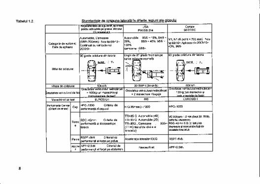 cu o varianta de incercare cu viteza de coliziune de 25 km/h. Se observa ca la scaderea vitezei de coliziune rigiditatea ramâne aproximativ constanta la deformatii mai mari de 0.2 m spre deosebire de cazul vitezei de coliziune de 50 km/h unde rigiditatea prezinta o crestere. Aceasta crestere se poate explica prin faptul ca in cazul vitezei de coliziune de 50 km/h participarea motorului la marirea rigiditatii este mai mare. Influenta gradului de acoperire rezulta din figura 2.15 unde se prezinta suprapus variatia rigiditatii structurii pentru viteza de coliziune Vo = 50 km/h pentru impactul frontal 100 % si decalat (offset) 50%. Se observa ca la impactul decalat deformatia se mareste considerabil, dar cresterea rigiditatii cu deformatia este mai lenta.