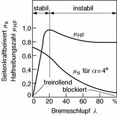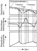 umed pelicula de apa Pentru a obtine un spatiu de franare minim,sistemul ABS regleaza presiunea din circuitul de franare ,astfel incat patinarea sa ramana in limitele de mai sus,respectiv in zona coeficientului de adrenta maxim. Prin evitarea blocarii rotilor apare al doilea avantaj si anume mentinerea unei forte de ghidare laterala pe pneu,care in conditiile rotilor puntii spate favorizeaza stabilitatea miscarii (evita derapajul) iar la rotile din fata favorizeaza mentinerea capacitatii de manevrare a automobilului in timpul procesului de franare. In cazul in care se controleaza,pe langa patinare,si alunecarea rotilor motoare, prin reglarea fortei de tractiune la roata motoare avem un sistem combinat ASR-ABS.Sistemul ASR are efectul unui diferential autoblocabil,in sensul ca permite transmiterea momentului motor la roata cu aderenta mai mare. Expresia patinarii este: S = (V - Vr)/V sau S= 1- wr/w unde V, este viteza centrului rotii (viteza automobilului); Vr,viteza periferica a rotii. w, viteza unghiulara a rotii corespunzatoare vitezei de translatie a automobilului; wr, viteza unghiulara a rotii. In mod corespunzator se defineste alunecarea : A = (Vr-V)/Vr sau A = 1 - w wr ; Controlul alunecarii se efectuiaza in functie de diferenta de turatie intre rotile motoare, in doua etape: -in prima etapa se reduce momentul transmis rotilor motoare prin reducerea unghiului de avans la aprindere (interventie la motor) sau prin interventie la clapeta de acceleratie (E-Gas); -in etapa doua,daca nu se micsoreaza diferenta de turatie intre rotile motoare,se introduce un moment de frânare prin cilindru receptor (sau camera pneumatica),la roata care are alunecarea mai mare. Aceste principii stau la baza sistemului de control a alunecarii (ASR): Din echilibrul rotii franate rezulta :