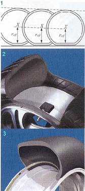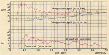 In diagramele de mai jos ,se prezinta pe baza unui exemplu de calcul variatia principalelor marimi relevante pentru procesul de blocare a rotii cu pneu. Fig.2 Procesul de blocare a rotii cu pneu franate Principiul de functionare a sistemelor de antiblocare (ABS) In schita de mai jos ,se prezinta schema bloc a sistemului ABS pentru o singura roata.Prin pompa centrala 2 se creiaza presiunea hidraulica de actionare a franei 3.Sensorul de turatie 5 transmite semnalul functie de turatia rotii regulatorului,format dintr-un microcontroller 4.Informatia primita de microcontroller este prelucrata dupa un algoritm logic ,iar parametrii relevanti pentru blocarea rotii sunt comparati cu marimi de prag stocate in memoria fixa a microcontrollerului.In cazul cand rezulta ca roata este la limita blocarii,semnalul de iesire din regulator comanda o reducere a presiunii de franare prin blocul electrohidraulic 1. Fig.3 Schema de principiu a sistemului ABS Ciclul de functionare a sistemului ABS rezulta din figura de mai jos. Fig.3 Ciclul de functionare a sistemului ABS Performantele autoturismelor echipate cu ABS In tabela 2 se prezinta rezultatele incercarilor de franare a unor autoturisme echipate cu ABS.Graficul cuprinde limitele spatiului de franare Sf,realizate din 10 probe de la viteza initiala Vo=100 km/h pana la oprire pe drum asfaltat,orizontal,uscat.Autoturismele au fost lestate la 0.5 din masa utila. Tabela 2 Marca spatiul de franare (m) deceleratia de la Vo=100 km/h medie autoturismului(Tip) min max min max Alfa Romeo Spider V6 39 41 Audi A3 TDI 42 45 Audi A4 Avant 1.8 41 45 Audi A4 Avant TDI 37 40 BMW 318i touring 41 42 BMW 725 TDS 38 40 BMW 735i A 37 38 BMW z3 1.8i 38 41 Chrysler Voyager SE 43 46 Citroen Saxo 1.4i 44 45 Citroen Xantia Break 2.1 TD 42 43 Citroen Evasion 2.1 TD 49 53 Daihatsu Charade 51 54 Fiat Marea 2.0 39 42 Fiat Marea Weekend 1.8 16 V 42 46 Fiat barcheta 45 48 Ford Escort 1.8TD Turnier 44 46 Ford Mondeo GT 2.0 42 44 Honda Accord 1.8 40 43 Honda Accord 2.0 41 44 Honda Legend 40 45 Hyundai Coupe 40 42 Hyundai Sonata V6 41 43 Jaguar XJ6 3.2 39 45 KIA Sephia 43 45 KIA clarus 1.8 41 43 Lancia Delta 1.8 GT 41 43 Lancia Kappa 2.4 Station 42 45 Mazda 121 47 48 Mazda Xedos 9 Miller 42 44 Mercedes C 180 T 38 40 Mercedes C 250 T 37 39 Mercedes E 290 T 39 40 Mercedes V 230 43 45 Mitsubishi Colt 1.3 43 47 Mitsubishi Colt 1.6 43 44 Nissan Micra 1.3 44 46 Nissan Almera D 40 49 Nissan Almera 2.0 GTI 47 50 Nissan primera 1.6 45 47 Opel Astra 1.6i 45 45 Opel Vectra Caravan 1.6 16V 42 45 Peugeot 106 XN 1.0 44 46 Peogeot 106 XR 1.4 47 51 Renault Clio RT 1.4 46 51 Renault Megane 1.6e 45 48 Rover 825 Si 43 57 Saab 900 S 42 44 Seat Cordoba 1.8 GLX 44 58 Seat Alhambra 1.9 TDI 42 44 Subaru Impreza 2.0 GL 45 51 Suzuki Baleno Kombi 1.6 46 52 Suzuki Vitara X90 42 42 Toyota Starlet 1.3 47 51 Toyota Carina 1.8 42 45 Toyota Picnic 45 48 Volvo S 40 2.0 16V 39 41 VW Polo D 44 48 VW Golf GT TDI Variant 43 44 VW Sharan 2.0 43 46 Dupa "MOTORWELT" Nr.2/1997 Deceleratia medie se obtine din relatia: d = Vo˛/(26*Sf) = 384.6/Sf [m/s˛] Cu datele din tabela