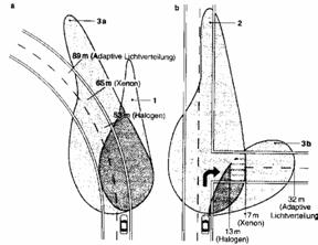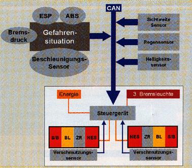 Fig.19 Lumina spate tip reflector Lumina spate cu optica Fresnel Propuneri privind un sistem adaptiv de siguranta prin utilizarea actualelor mijloace: -Luminozitatea si intensitatea luminoasa adaptata la conditiile de vizibilitate; -Suprafata luminoasa variabila in functie de intensitatea semnalului; -Frecventa,folosita in prezent numai la schimbarea de mers,poate fi utilizata la avertizare suplimentara. Fig.20 Schema de principiu a unui sistem adaptiv de semnalizare (ASS) Cu aceste marimi s-ar putea inbunatatii patru grupe de situatii de trafic adaptiv : -Situatii de pericol –acestea sa fie indicate diferentiat fata de franarea standart.Utilizand o activitate ESP sau ABS vehiculul din urma poate fi avertizat asupra apropierii sale