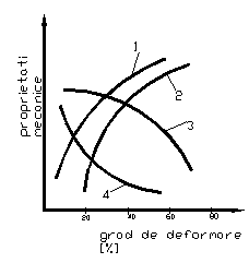 În figura 1 este prezentata variatia unor proprietati mecanice în functie de gradul de deformare: 1- rezistenta la rupere; 2- limita de curgere; 3- gâtuirea la curgere; 4- alunecarea la rupere.