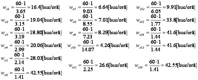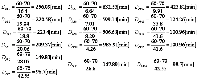 1) w1 < w2 D1, 2 = 1024.39 - 882.35 + 220.58 = 362.62 [min] 2) w2 > w3 D2, 3 = 220.58 [min] 3) w3 < w4 D3, 4 = 893.61 - 837.48 + 209.37 = 265.5 [min] w4 < w5 D4, 5 = 837.48 - 588.35 + 149.83 =398.96 [min] w5 < w6 D5, 6 = 599.35 - 394.82 + 98.7 = 303.23 [min] 6) w6 > w7 D6, 7 = 98.7 [min] 7) w7 < w8 D7, 8 = 2530.12 - 2396.57 + 599.14 = 732.69 [min] 8) w8 < w9 D8, 9 = 2396.57 - 2026.53 + 506.63 = 876.67 [min] 9) w9 > w10 D9, 10 = 506.63 [min] 10) w10 < w11 D10, 11 = 3943.66 - 631.57 + 157.89 = 3469.98 [min] 11) w11 > w12 D11, 12 = 157.89 [min] 12) w12 < w13 D12, 13 = 1695.25 - 497.04 + 124.26 = 1322.47 [min] 13) w13 < w14 D13, 14 = 497.04 - 403.86 + 100.96 = 194.14 [min] 14) w14 15) w15 < w16 D15, 16 = 403.86 - 394.82 + 98.7 = 107.74 [min] e) momentul începerii fabricatiei Tî Tîi =Tîi + DNi [min] T = 0 [min] T 362.62 = 362.62 [min] T 362.62 + 220.58 =583.2 [min] T 583.2 + 265.5 =848.7 [min] T 848.7 + 398.96 =1247.66 [min] T 1247.66 + 303.23 =1550.89 [min] T 1550.89 + 98.7 = 1649.59 [min] T 1649.59 + 732.69 =2382.28 [min] T 1382.28 + 876.67 = 3258.95 [min] T 3258.95 + 506.63 = 3765.58 [min] T 3765.58 + 3469.98 =7235.56 [min] T 7235.56 + 157.89 = 7393.45 [min] T 7393.45 + 1322.47 = 8715.92 [min] T 194.14 =8910.06 [min] T 100.96 =9011.02 [min] T 9011.02 + 107.74 = 9118.76 [min] f) momentul încheieri fabricatiei Tfi Tfi = Tîi + DNi [min] Tf1 = 0 + 1024.39 = 1024.39 [min] Tf2 = 362.62 + 882.35 = 1244.97[min] Tf3 = 583.2 + 893.61 = 1476.81 [min] Tf4 = 848.7 + 837.48 = 1686.18 [min] Tf5 = 1247.66 + 599.35 = 1847.01[min] Tf6 = 1550.89 + 394.82 = 1945.71[min] Tf7 = 1649.59 + 2530.12 = 4179.71[min] Tf8 = 2382.28 + 2396.57= 4778.85[min] Tf9 = 3258.95 + 2026.53 = 5285.48[min] Tf10 = 3765.58 + 3943.66 = 7709.24[min] Tf11 = 7235.56 + 631.57 = 7867.13[min] T12 = 7393.45 + 1695.25 = 9088.7[min] Tf13 = 8715.92 + 497.04 = 9212.96[min] Tf14 = 8910.06 + 403.86 = 9313.92[min] Tf15 = 9011.02 + 403.86 = 9414.88[min] Tf16 = 9118.76 + 394.82 = 9513.58[min] g) stocurile de productie neterminate intre operatii Pni i