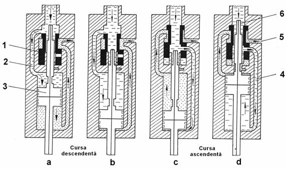 Cand pistonul ajunge la sfarsitul cursei descendente (fig. 6.2.b), datorita diametrului redus al capatului tijei, presiunea fluidului motor se exercita si pe fata inferioara a valvei de distributie. Aceasta fata avand o suprafata mai mare decat cea superioara, valva este deplasata in sus (fig 6.2.c), astfel ca fluidul motor este acum dirijat prin canalele 4 sub piston si acesta incepe cursa ascendenta. Datorita formei valvei de distributie, fluidul motor refulat de deasupra pistonului este impins prin canalele 2, prin orificiile de evacuare ale valvei, apoi tot prin canalele 5 in spatiul inelar.