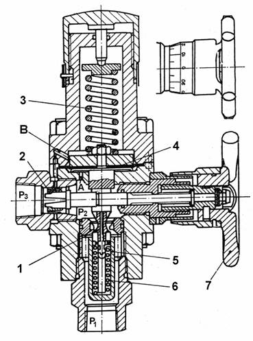 a) Valva principala 1, echilibrata, a carei deschidere depinde de pozitia tijei sale. Pozitia acestei tije se auto stabilizeaza prin echilibrul fortelor ce actioneaza asupra sa si anume: eforturile din arcurile 3 si 6 si forta datorata presiunii diferentiale pe membrana 4. La partea inferioara, tija este prevazuta cu cilindrul de echilibrare hidraulica 5.