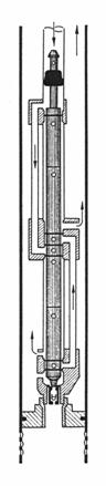 In acelasi timp cu deplasarea pistonului motor se produce si deplasarea pistonului pompei, ambele fiind fixate pe tija comuna 4. In cilindrul pompei (vezi fig 6.1.) se gasesc doua supape de admisie 5 si doua de refulare 6, primele comunicand cu sonda prin canalele 7, iar celelalte punand in comunicatie interiorul cilindrului pompei cu canalele de impingere a lichidului din sonda in spatul inelar. Deci, spre deosebire de pompele de extractie obisnuite, pompa hidraulica tip Kobe lucreaza cu dublu efect.