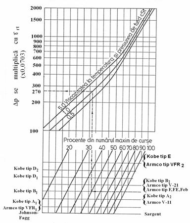 Pierderile de presiune prin pompa cuprind pierderile de presiune din pompa cu piston motor (motorul hidraulic) cat si cele din pompa propriu-zisa. Valoarea lui Dpp se determina cu ajutorul diagramei din fig, 6.11, in functie de vascozitatea cinematica a fluidului motor la temperatura de la nivelul pompei, de raportul nr. de curse/ nr. maxim de curse (%) si de tipul pompei.