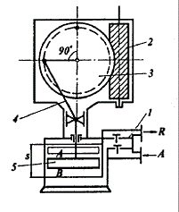 In fig. 1 este o masina cu piston cu o singura fata activa, de tip duplex. Pompa are doua pistoane calate la 90˚. Acest tip de masina hidraulica are o larga utilizare la bordul navei deoarece debitarea este mai uniforma decat prin varianta simplex, iar realizarea ei in varianta constructiva verticala reduce spatiul necesar amplasarii. In figura s-au facut notatiile: 1 - elemente de distributie; 2,3- reductor melc-roata melcata, 4- sistem biela-manivela; 5- piston.