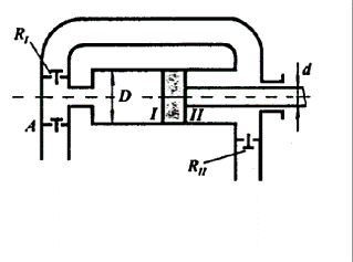 Pompa cu actiune diferentiala reprezinta o combinatie intre pompa cu simplu efect si pompa cu dublu efect. Acest tip de pompa, a carei schema este reprezentata in fig. 3, este destul de rar intalnit in practica. La deplasarea pistonului spre dreapta, in spatiul I se produce o scadere a presiunii care deschide supapa de aspiratie A, lasand sa patrunda in cilindru o cantitate de lichid egala cu volumul dezlocuit. Concomitent, lichidul aflat in spatiul II este refulat de supapa R 11 in conducta de refulare. Acest volum de lichid este mai mic decat volumul din spatiul I cu valoarea volumului dezlocuit de tija pistonului d. La cursa pistonului spre stanga, lichidul din spatiul I este refulat in spatiul II de volum mai redus, astfel ca surplusul prin supapa R 11 in conducta de refulare. In acest fel, in spatiul I, pistonul are simplu efect, iar spatiul II are dublu efect. Prin urmare pompa debiteaza lichid in ambele curse, ceea ce reduce intr-o oarecare masura neuniformitatea debitarii.