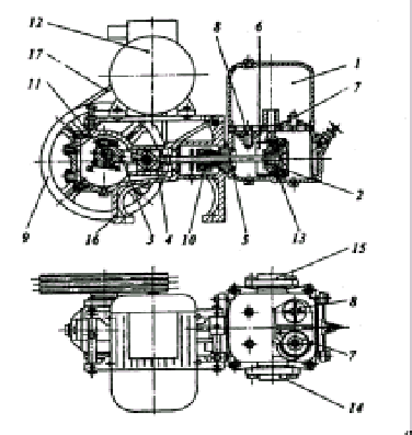 Masina prezentata in fig. 4 este o pompa cu dublu efect, cu doua pistoane decalate la 180˚, fiecare piston avand doua fete active. Organul de lucru reprezentat de pistonul 2 determina in cilindrul 6 cele doua cavitati de lucru. Efectul de pompare apare ca urmare a deplasarii pistonului sub actiunea tijei 5 antrenate de motorul electric 12 prin lantul cinematic format din rotile de curea 9, curelele 17, excentricul 11, biela 3 si capul de cruce 4. Distributia fluidului de lucru se face cu ajutorul supapelor 7 si 8, de refulare, respective aspiratie. Pompa aspira din tubulatura de aspiratie a instalatiei si refuleaza in recipientul 1 montat pe pompa si care joaca rolul de acumulator hidraulic destinat uniformizarii debitului de lichid refulat.