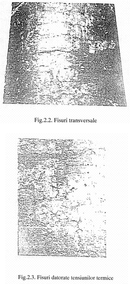 1. Fisurile transversale pe suprafata firului sunt cauzate de tensiuni pe directia longitudinala a firului (fig. 2). Tensiunile longitudinale pot genera la randul lor tensiuni termice datorita solidificarii neuniforme, frecarea firului in cristalizator si deformarea crustei firului in timpul indoirii sau indreptarii firului. Efectul crestaturii semnelor de oscilatie pe fir pot favoriza fisurarea transversala. In general fisurile transversale nu sunt obisnuite la profilele rotunde turnate continuu.
