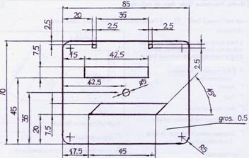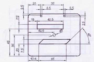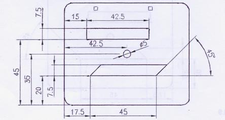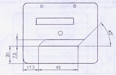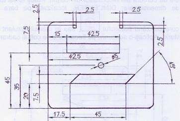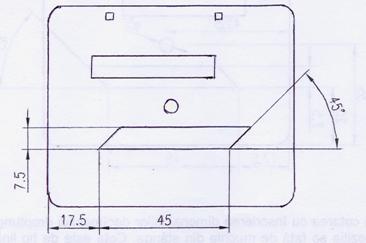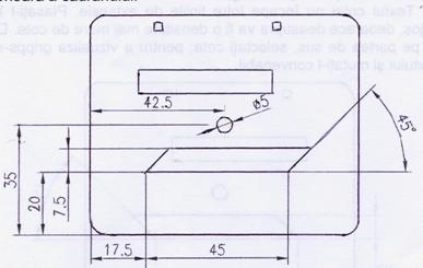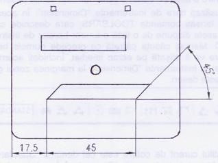 Se continua cotarea cu înscrierea dimensiunilor decupajului dreptunghiular. Se coteaza pe orizontala pozitia sa fata de mughia din stânga. Cota este de tip liniar si se dispune peste proiectie, deasupra orificiului. In continuarea acestei cote, pe orizontala, se masoara lungimea decupajului.