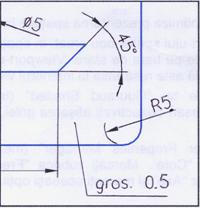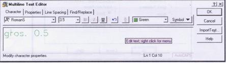Se puncteaza în 200,140, pentru primul punct al liniei de indicatie, apoi, oblic, în afara conturului cadranului, de exemplu, în 235,145. Se introduce un raspuns nul pentru al treilea punct (adica se tasteaza <ENTER>. Se trece tot cu un raspuns nul peste intrebarea privind latimea textului.Se opteaza apoi pentru "Mtext"fortând programul sa descchida editorul intern pentru textele de tip paragraf. Se stabileste o inaltime a caracterelor de 3.5 unitatii în rubrica "Font height". Apoi se înscrie textul gros. 0.5(vezi figura ) si se îchide prin "OK" editorul intern de texte.