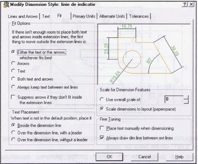 In caseta "Dimension Style Manager" se selecteaza stilul "Standard" si se actioneaza butonul "Modify". Se activeaza panoul "Fit". In grupul de informatii "Scale for Dimension Features", se opteaza pentru "Scale dimensions to layout (paperspace)", ca în figura de mai jos: