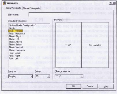 Pentru a vizualiza optim procesul de "îngrosare" prin extrudare, se împarte ecranul în doua viewport-uri. In acest scop, din meniul derulant "View", se selecteaza linia "Viewports", si optiunea "New Viewports". In caseta de dialog deschisa, se opteaza pentru doua viewport-uri dispuse pe verticala, cu stabilirea conditiilor de vederi 3D în rubrica "Setup", ca în figura urmatoare: