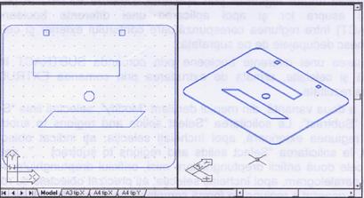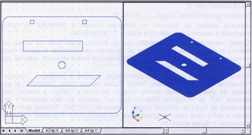 Pentru a defini un viewport cu prezentarea spatiala a modelului, se selecteaza linia "Viewports" din meniul derulant "View". Se opteaza pentru "New Viewports" si apoi, în caseta de dialog deschisa, pentru "Single". In rubrica "Setup"a casetei, se selecteaza varianta "3D", iar în rubrica "Change viewto:", se alege din lista disponibila vederea izometrica de Sud-Est. Se închide caseta "Viewports" prin "OK". Se puncteaza apoi pe format pentru a defini doua colturi diagonal opuse ale viewport-ului. O posibila dispunere este prezentata în figura urmatoare: