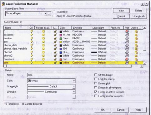 Se deschide caseta "Layer Properties Manager" (meniul derulant "Format", linia "Layer").Se selecteaza layer "Cote".Se marcheaza rubrica "Freeze in active viewport", din dreapta-jos.Se selecteaza layer "Axe" si se marcheaza aceeasi optiune.FiguraXXVIII.