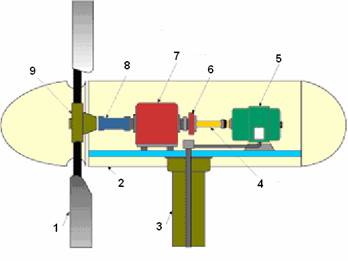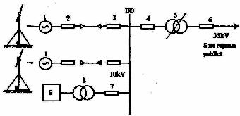 1 - aerogenerator; 2, 3,4, 6, 7 - īntrerupatoare automate; 5 - transformator 10/35kV; 8 - transformator 10/0,4 V; 9 - consumatori proprii.