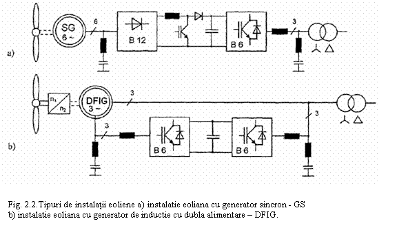 Instalatia eoliana cu viteza variabila, reprezentand metoda moderna, utilizeaza in mod uzual generatoare de inductie cu dubla alimentare (DFIG), avand avantajul utilizarii eficiente a energiei vantului, reducerii partii mecanice (nacela usoara, cutie de viteze redusa sau absenta si turn zvelt), dar avand o parte electrica si electronica complexa, necesitand algoritmi de conducere pretentiosi. Viteza mecanica de rotatie a masinii poate fi controlata prin reglarea frecventei curentului de alimentare a rotorului. Aceste elemente si modul in care se pot interconecta centralele eoliene sunt prezentate in lucrarea - Bringing wind power ashore - (Brian Richardson, Peter Jones), IEE Power Engineer , February/March 2004. Doua tipuri de instalatii eoliene sunt prezentate in figura 2.2: