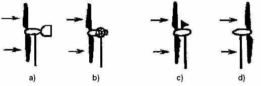 a - cu stabilizator, b - cu vendroza, c - cu servomotor, d - cu autoorientare (īn spatele turnului)
