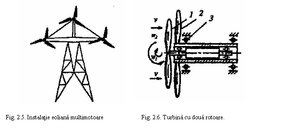 Anumite avantaje pot fi obtinute la folosirea aeromotoarelor cu doua rotoare coaxiale (fig. 2.6). Rotoarele au sens opus de rotatie si sunt cuplate rigid sau prin cuplaje elastice respectiv cu rotorul electrogeneratorului si statorul acestuia care se roteste īn lagare proprii. Daca ambele rotoare ale aeromotului au, de exemplu, turatia nominala de 350 rot/min atunci se va putea utiliza un electrogenerator de viteza īnalta (700 rot/min) fara reductor intermediar.