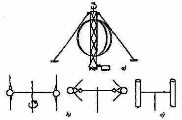Īn instalatiile de putere mica īn acest scop sunt prevazute stabilizatoare (fig. 2.4, a) sau dispozitive multipale cu transmisie melcata, numite vendroze (figura 2.4, b). La puteri mari instalatiile se doteaza cu sisteme hidraulice de orientare cu comanda de la calculator (fig. 2.4, c). Captatorul de semnale de directia si viteza a vāntului, de regula de tip electroanemometric, este amplasat īn afara zonei de influenta a turbinei la īnaltimea respectiva de la sol.