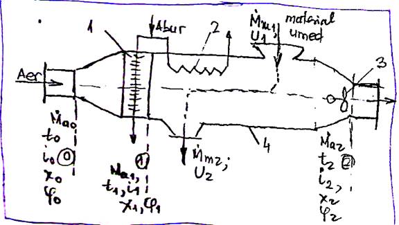 Aerul rece preluat din mediul ambiant de catre ventilatorul 3 este incalzit in bateria de incalzire si circula in contracurent cu materialul supus uscarii absorbint o parte din umiditatea materialului dupa care e eliminate din uscator.Uneori aerul de uscare se incalzeste suplimentar in camera de uscare cu ajutorul unei surse suplimentare de caldura 2 ce are fluxul de caldura Qs.Din bilantul material se poate stabili consumul: