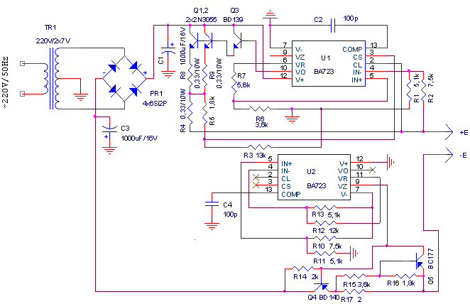 Stabilizatorul de tensiune este realizat pe baza a 2 CI bA723, dupa o schema cu reactie si ERS,si cuprinde 2 surse de alimentare:
