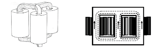 Miez monofazat cu coloane, in manta. Fluxul fiecarei faze se inchide in miezuri separate. Nu exista cuplaj magnetic intre faze.