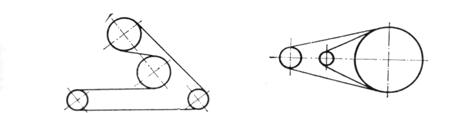 Transmisia cu roti multiple este aceea la care exista mai multi arbori condusi si eventual mai multi arbori motori. Cea mai frecvent utilizata varianta constructiva este cea cu infasurare normala a curelei pe rotile de curea, cureaua infasurand rotile de curea de-a lungul unui anumit arc. Exista cazuri cand pe o roata sunt infasurate doua curele suprapuse (solutie constructiva folosita rar).(fig.6 si fig. 7)