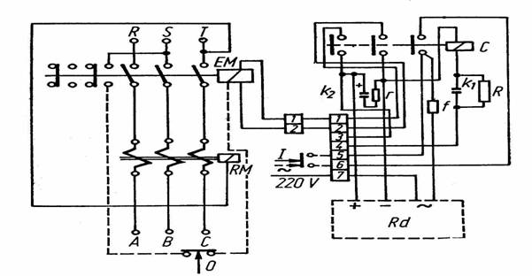 In figura 3 este reprezentata schema electrica a unui intreruptor AMT in care EM este electromagnetul de actionare ; RN-declansatorul de tensiune minima ; C-contactorul de comanda ;R si r-rezistente de descarcare ; k1-condensator de temporizare ; k2-condensator de descarcare ; Rd-redresorul de alimentare ;f-siguranta fuzibila.